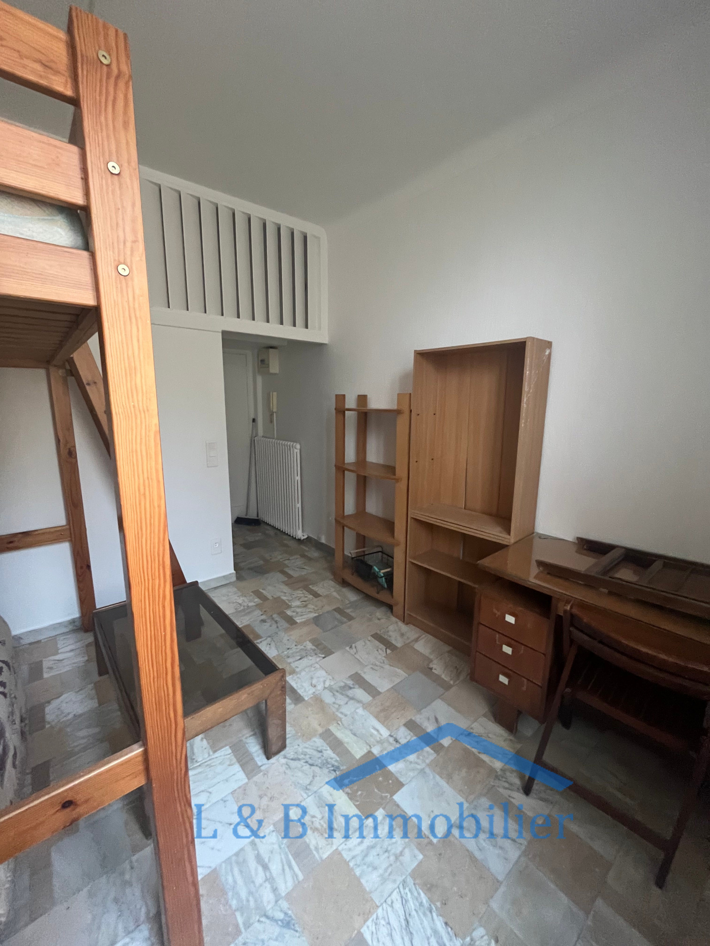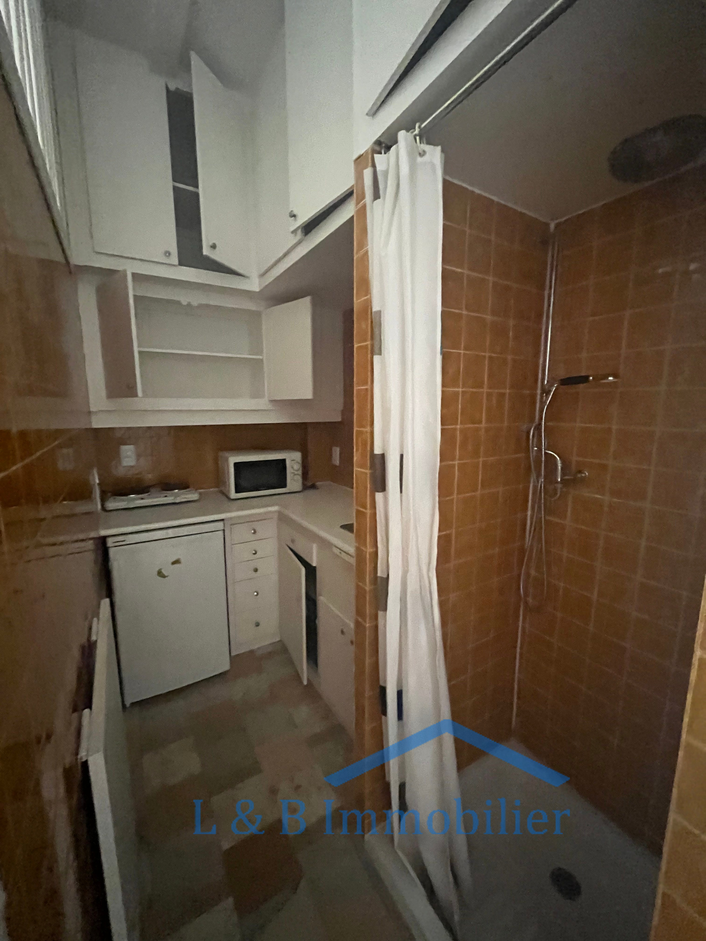 Sa surface offre : une pièce à vivre aménagée avec rangement, un coin cuisine et cabine de douche, WC sur le palier.